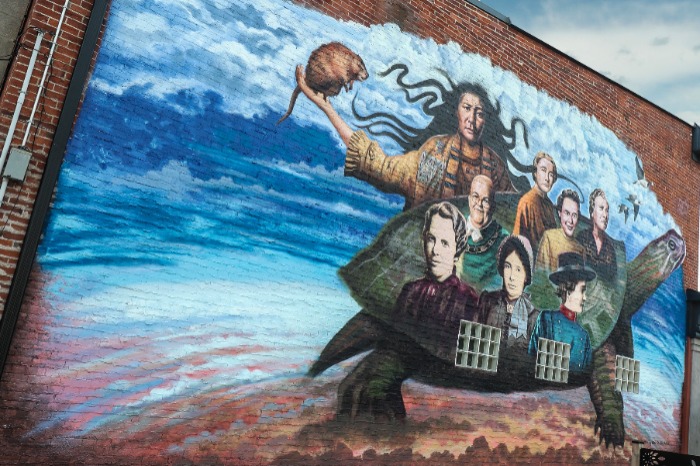 The story of the Sky Woman is part of the local indigenous culture. The Sky Woman falls from the sky and is greeted and carried by sky animals to land on the back of a great turtle. With the help of a muskrat, she acquires a handful of soil from the deep waters and begins to form Turtle Island (North America).