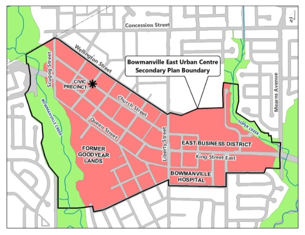 The Bowmanville East Urban Centre Secondary Plan Area will create a unique community identity that celebrates Bowmanville’s heritage while accommodating growth and change. The Plan area includes the historic downtown, Bowmanville Hospital, Bowmanville Mall, and former Goodyear lands. The area will be transformed with a potential medical campus to support the Bowmanville Hospital and mixed-use development opportunities along King Street East, in the east business district. The former Goodyear lands is planned to feature mixed-use development and is envisioned to include park space and a new connection to Bowmanville Creek.
