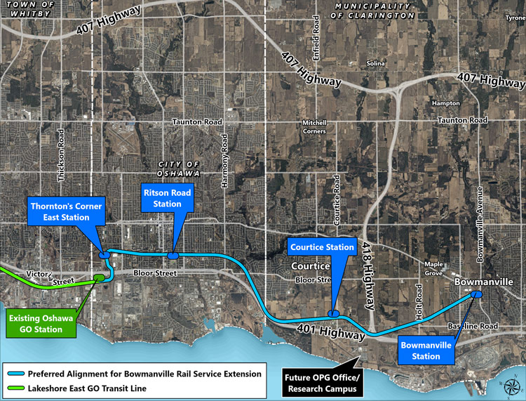 The proposal adheres to Council’s resolutions supporting the option with the preferred route north of Highway 401 using the CP railway line. The selected option supports the previous Transportation Hub work that was completed in July 2017 by Clarington Planning Staff as well as the ongoing Secondary Plan projects in Courtice and Bowmanville.