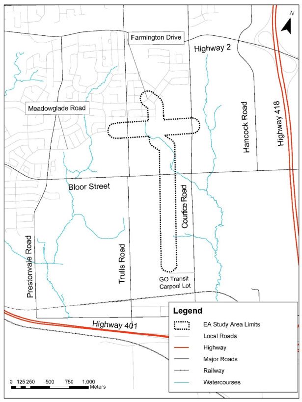 The Municipality of Clarington, in partnership with the Southeast Courtice Landowner’s Group, is initiating a Schedule ‘C’ Municipal Class Environmental Assessment (MCEA) for the extensions of Meadowglade Road to Courtice Road (Regional Road 34) and Farmington Drive to the future Townline Road extension to accommodate the traffic, transit, and active transportation demands anticipated from the planned developments in the area. Both road extensions were identified in the Southeast Courtice Secondary Plan Study and the ongoing Courtice Transit-Oriented Community and GO Station Secondary Plan Study.