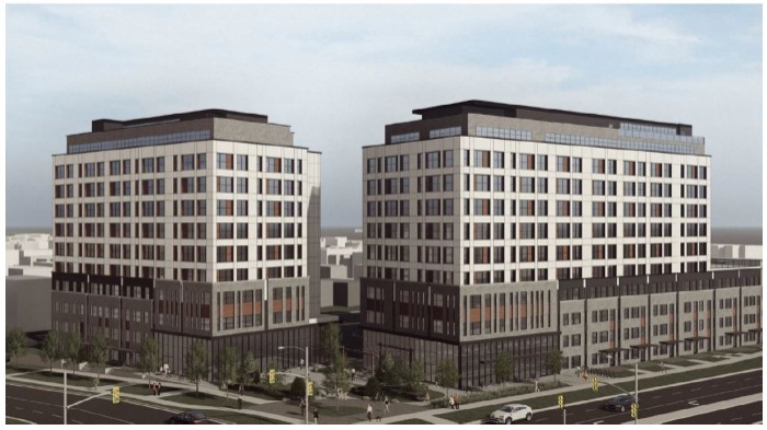 Zoning By-law to permit a multi-residential, mixed-use development to be constructed in 2 phases. The proposal includes two 11-storey buildings with a total of 228 residential units comprised of condominium apartments and townhouses along with approximately 371 square metres (3,995 square feet) of commercial space on the ground floor. The site is about 0.96 hectares, resulting in a housing density of 238 units per hectare. The ongoing Site Plan application and a Plan of Condominium application will address the site plan details and tenure.
