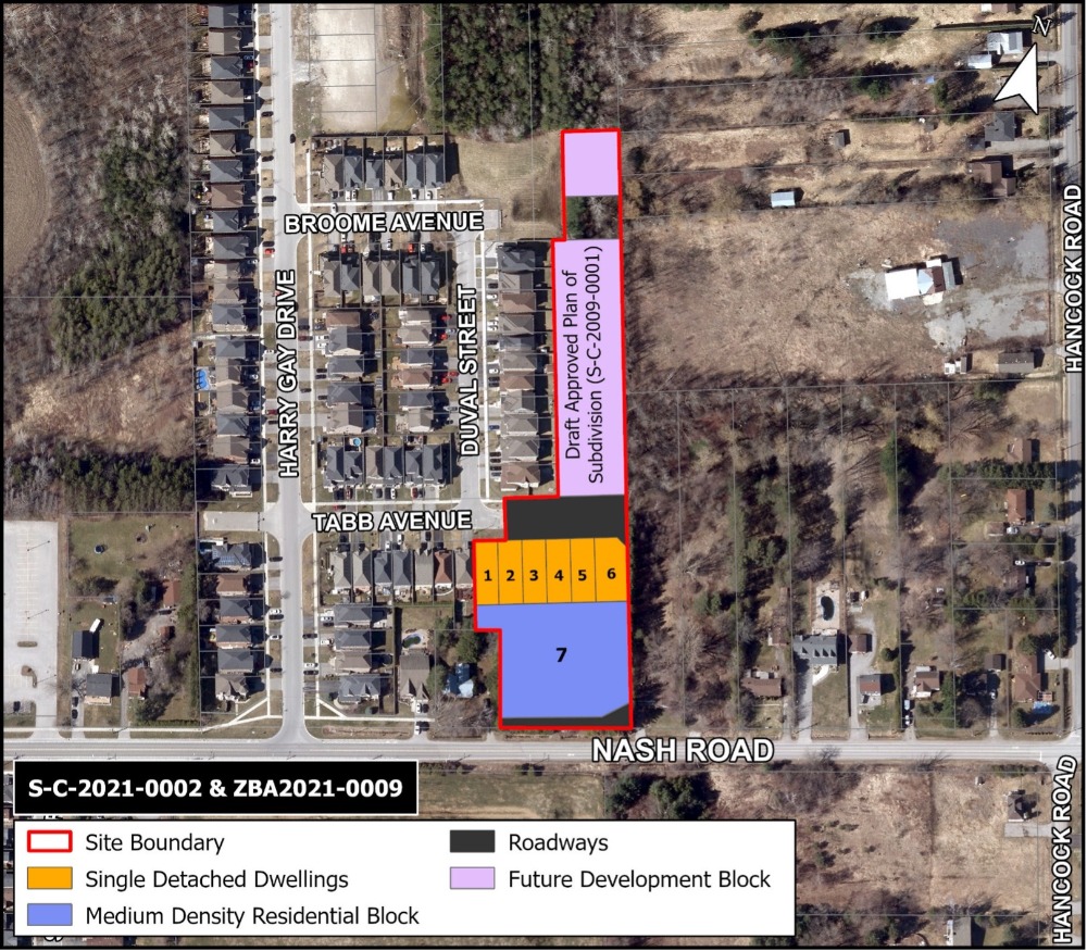 Headgate Developments Inc. has submitted applications for a Draft Plan of Subdivision and Rezoning to permit a plan of subdivision with six single-detached dwellings and a future townhouse block. The subdivision would extend Tabb Avenue to the east.