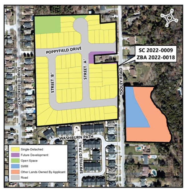 Baseline Properties Ltd. have submitted subdivision and zoning by-law amendment applications to permit 75 single-detached dwellings. The plan also includes blocks for open space, stormwater management facilities and future development.